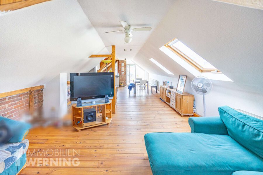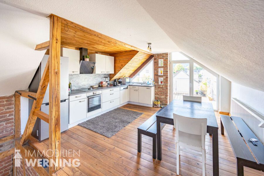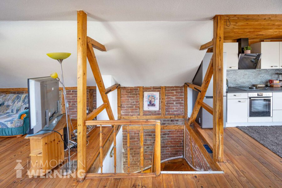 Das Dachgeschoss wurde als ein großer und offener Raum ausgebaut. An der Treppe blickt man auf freigelegte Holzbalken und Backsteinmauern. 2021 wurde auf dieser Ebene eine neue Küche eingebaut und die Fensterfront in Richtung der Terrasse erneuert.