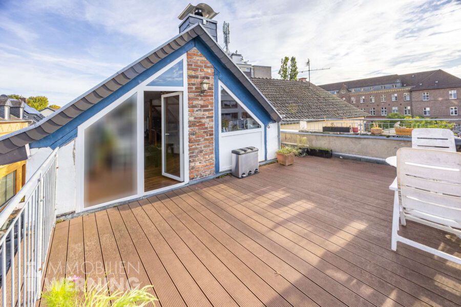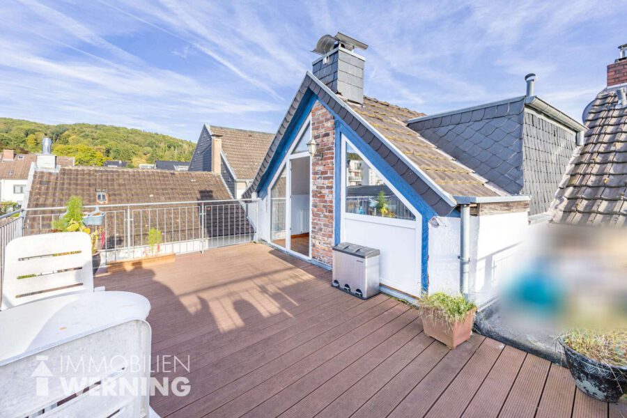 Die ca. 25m² große Dachterrasse bietet einen tollen Blick über Bad Honnef und bis auf den Drachenfels im Norden. Sie bietet genügend Platz für einen weiteren Esstisch. Die Nordfassade wurde aufwendig mit Schiefer verkleidet.