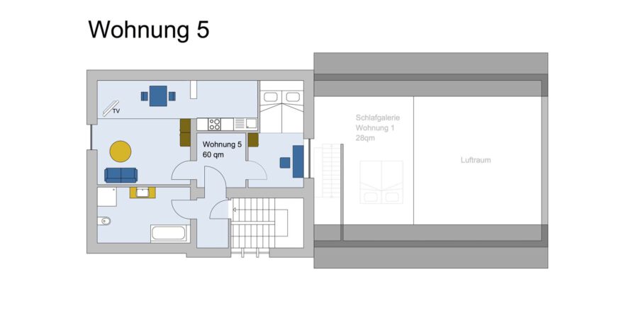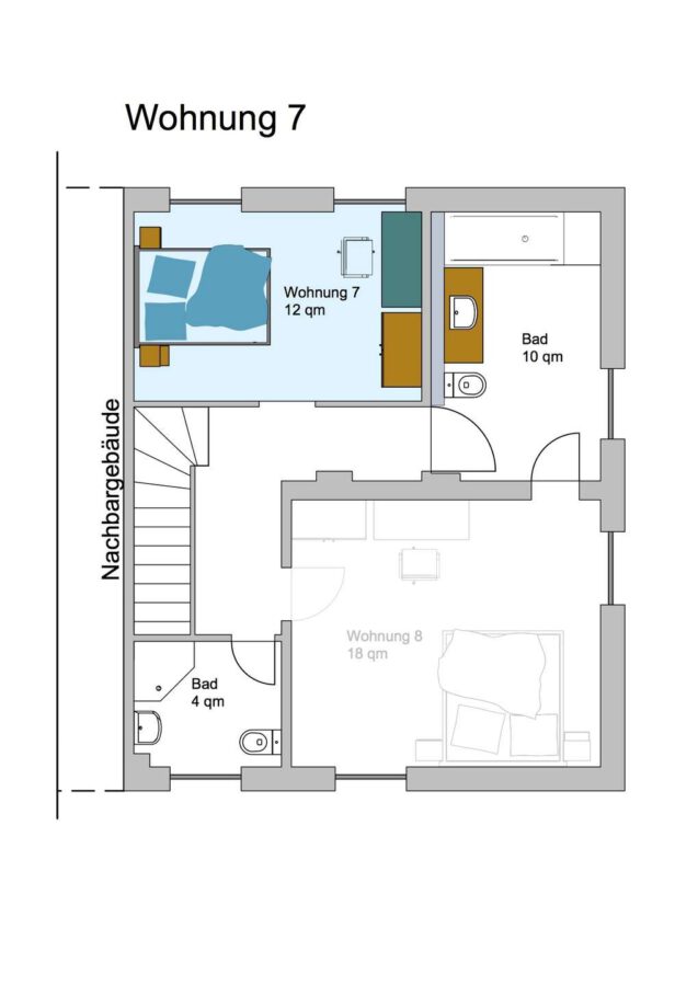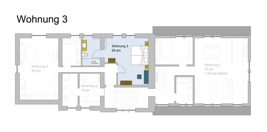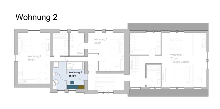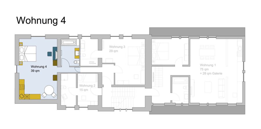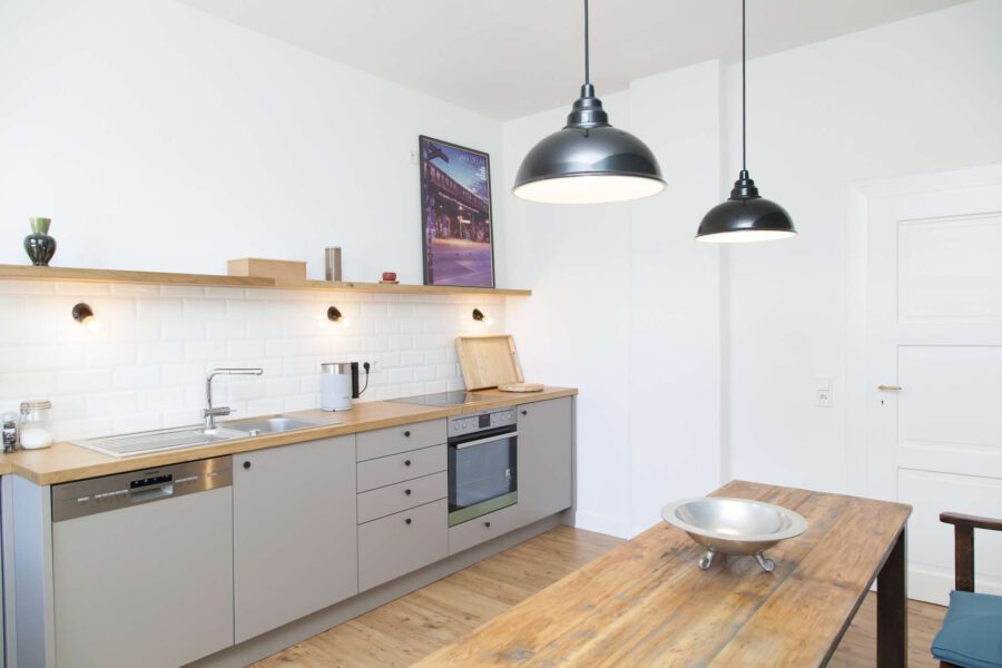 Im Gästehaus befinden sich 3 weitere Zimmer, die stilgleich mit den Zimmern im Bahnhof gestaltet sind sowie eine voll eingerichtete Gemeinschaftsküche. Eines der Zimmer ist – inklusive Bad – behindertengerecht ausgestattet.