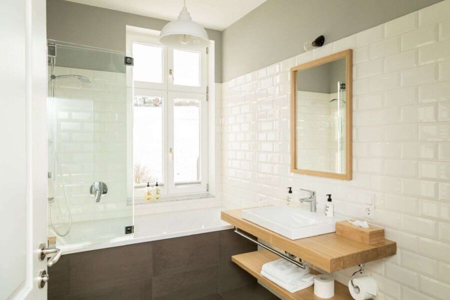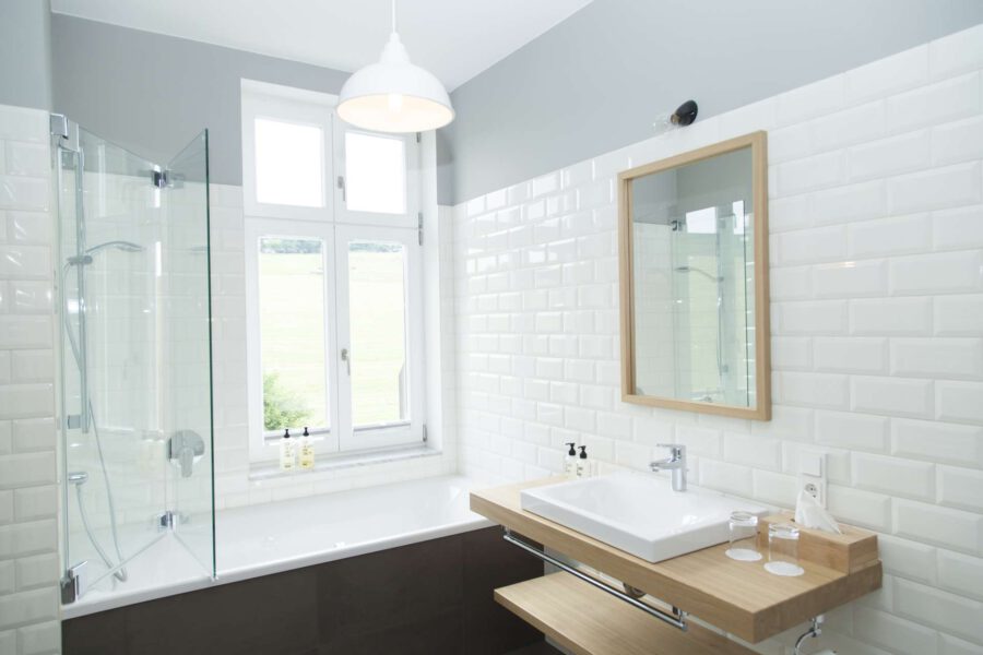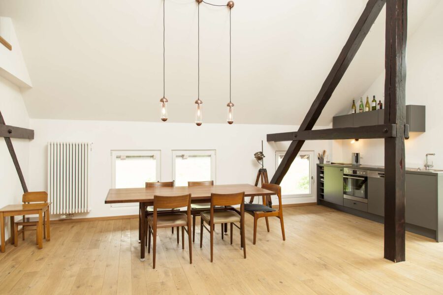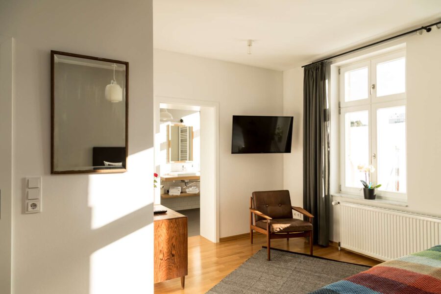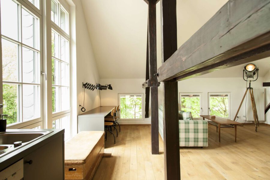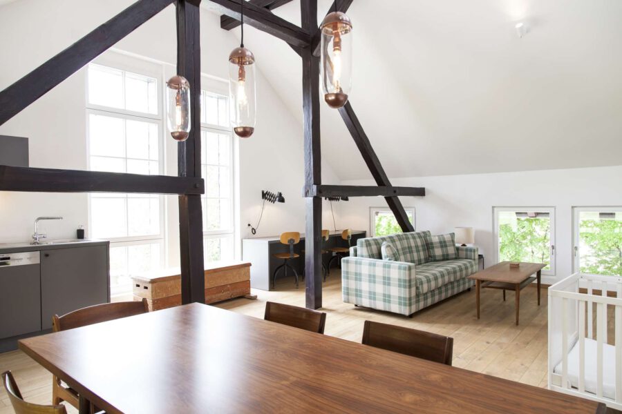 Im historischen Bahnhofsgebäude befinden sich fünf und im Gästehaus drei individuell eingerichtete Zimmer, die jeweils ihren eigenen Charme und Stil besitzen. Jedes Zimmer wurde mit Blick auf Komfort, Atmosphäre und hochwertige Materialien gestaltet. Die Ausstattung ist sehr hochwertig und vereint geschmackvoll historische Elemente und modernen Komfort. So ist ein unverwechselbares Ambiente entstanden, das Gäste sofort anspricht. Jedes Zimmer ist individuell gestaltet. Vintagestücke sind mit Design-Klassikern des 20. Jahrhundert kombiniert und geben das besondere Flair. Ergänzt wird der Komfort mit modernen Boxspringbetten, TVs, Bluetoothlautsprechern und Safes in allen Zimmern, und zum Teil mit Küchen. Sei es im Haupthaus oder im Gästehaus - allen Zimmer ist es gemein, dass sie über sehr hochwertig ausgestattete Badezimmer verfügen, die in Gestaltung und Materialauswahl ein einheitlich hohes Qualitätsniveau und ein stimmiges Designkonzept aufweisen. Je nach Zimmerkategorie sind die Bäder mit bodengleicher Dusche und/oder mit Wanne und Dusche ausgestattet. Moderne Sanitärinstallationen, pflegeleichte Oberflächen und eine zeitgemäße Ausstattung gewährleisten einen dauerhaften Werterhalt und geringen Instandhaltungsaufwand. Das Highlight ist die großzügige Maisonette-Suite im Bahnhof. Sie erstreckt sich über zwei Ebenen. Das bis zum First geöffnete Dach und die sichtbaren Holzbalken verleihen dem Raum eine warme, gemütliche Atmosphäre. Durch die große Sprossenfensterfront fällt viel Licht ein und öffnet einen weiten Blick in die Natur. Bis zu sechs Personen können hier Platz finden und sich auch für eine längere Zeit sehr wohl fühlen. Die weiteren vier Zimmer sind unterschiedlich groß und reichen vom Einzelzimmer bis zu Doppelzimmern, von denen sich 2 verbinden lassen. .Z.T. sind sie mit einer Kochecke ausgestattet. Insgesamt können 20 Personen übernachten.