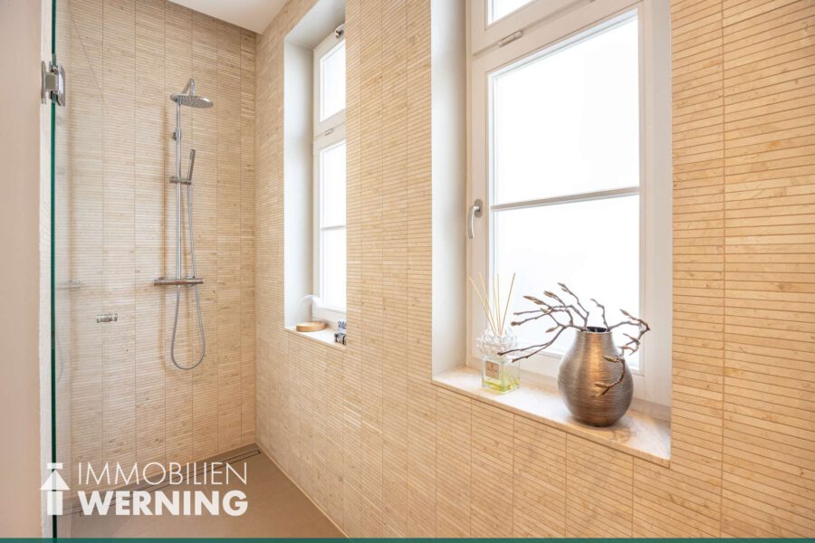 Daran schließt das sehr hochwertige erste Badezimmer an. Schmale Wandfliesen aus Travertin und eine bodengleiche Dusche bilden ein elegantes Gesamtbild.