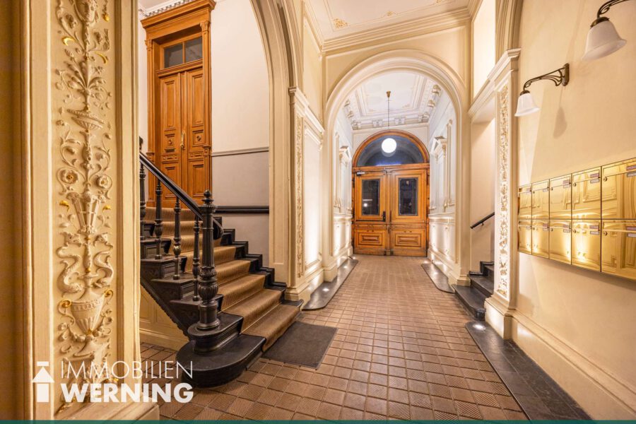 Sie betreten den Altbau in den klassischen Tordurchgang mit reich verziertem Wand- und Deckenstuck, vergoldeten Details und kunstvoll geschnitzten Holzarbeiten an der lackierten Treppe.