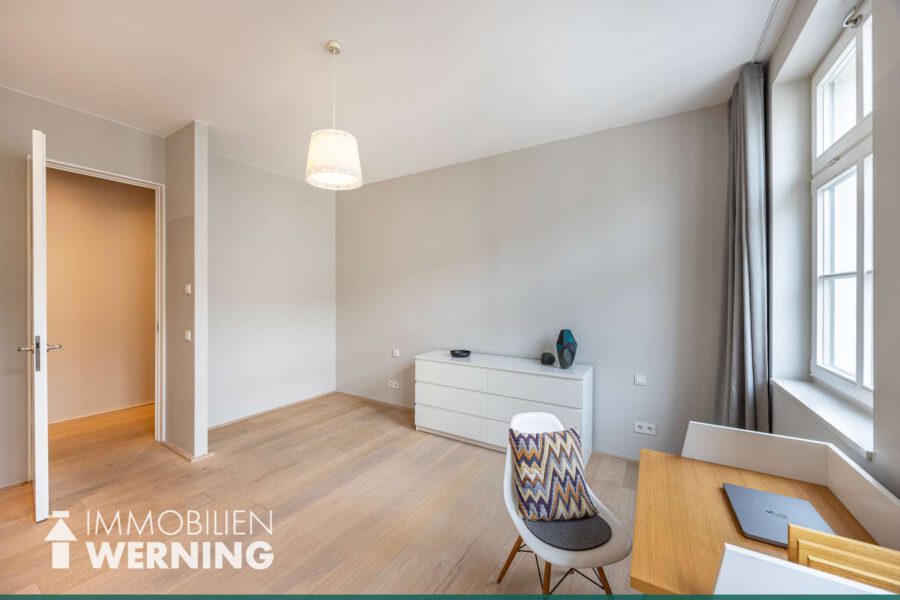 Als nächstes Zimmer gelangen Sie in das Kinderzimmer. Der ca. 16 m² große, ruhige Raum blickt durch zwei Sprossenfenster mit Oberlichtern in den Innenhof.