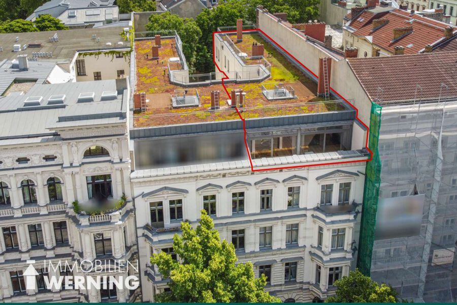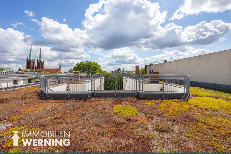 Über die feuerverzinkte Wendeltreppe im Atrium gelangen Sie auf das begrünte Dach des Penthouses. Die dichte Begrünung ist besonders pflegeleicht und sorgt neben dem verbesserten Wärmeschutz auch für ein sehr angenehmes Mikroklima. Von hier oben blicken Sie auf die neugotischen Türme der St.-Bonifatius-Kirche und bis zum Fernsehturm am Alexanderplatz.