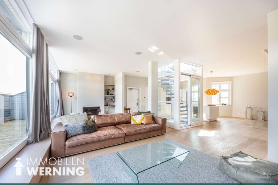 Mit dem Aufzug erreichen Sie die Halbetage vor dem Penthouse. Direkt durch die Wohnungstür betreten Sie das Herz der Wohnung – das ca. 90 m² große Wohnzimmer.