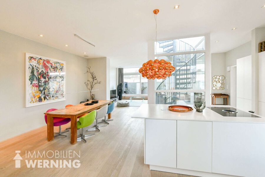 Die hochwertige Küche (Fa. SieMatic) verfügt über einen freistehenden Küchenblock mit Barbereich, Einbaugeräten von Miele und viel Stauraum. Daran schließt ein sehr großzügiger Essbereich an.